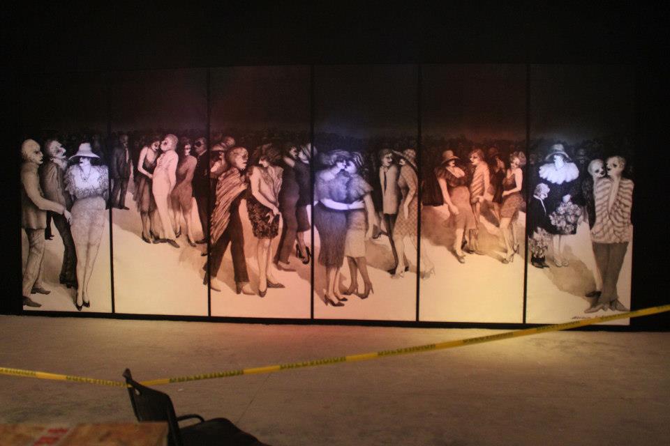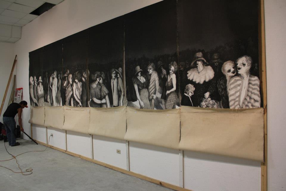 Si usted se detiene ante el mural, tal vez se sienta contemplando su enorme dibujo que está en deuda con la pintura, entonces seguramente mirará las pinceladas, se cuestionará sobre su proceso. También se dejará seducir por el manejo de las luces, por los tonos plateados que de ellas emana, recordará a Goya, reconocerá uno que otro rostro, y también es posible que encuentre uno casi idéntico al suyo. |